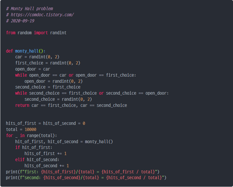 # Monty Hall problem # https://comdoc.tistory.com/ # 2020-09-19 from random import randint def except_and_random_choice(ex1, ex2): chosen = ex1 while chosen in (ex1, ex2): chosen = randint(0, 2) return chosen def monty_hall(): car = randint(0, 2) first_choice = randint(0, 2) open_door = except_and_random_choice(car, first_choice) second_choice = except_and_random_choice(first_choice, open_door) return car == first_choice, car == second_choice hits_of_first = hits_of_second = 0 total = 10000 for _ in range(total): hit_of_first, hit_of_second = monty_hall() if hit_of_first: hits_of_first += 1 elif hit_of_second: hits_of_second += 1 print(f"first: {hits_of_first}/{total} = {hits_of_first / total}") print(f"second: {hits_of_second}/{total} = {hits_of_second / total}")PS2) 떠오르는 생각의 흐름을 따라 코딩한다면 다음과 비슷할 겁니다.