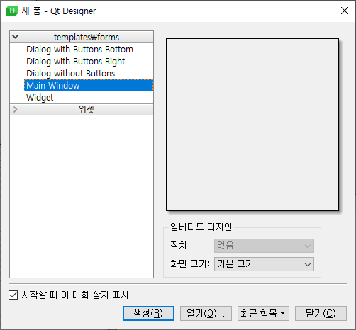 [프로젝트 폴더]\venv\Lib\site-packages\qt5_applications\Qt\bin\designer.exefrom PyQt5.QtWidgets import * app = QApplication([]) form = QDialog() form.show() app.exec_()이런 식의 코드도 다음과 같은 결과물을 만들 수는 있습니다.