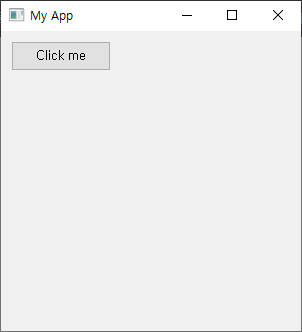from PyQt5.QtWidgets import QApplication, QMainWindow, QPushButton app = QApplication([]) my_window = QMainWindow() my_window.setWindowTitle('My App') my_window.setGeometry(100, 100, 300, 300) # QPushButton 의 첫번째 인수는 버튼의 Title 입니다. # 두번째 인수는 상위 위젯을 의미합니다. # 버튼은 my_window 의 내부에 있게됩니다. button1 = QPushButton('Click me', my_window) button1.move(10, 10) my_window.show() app.exec_()https://github.com/pycrawling/pyqt5_study/blob/main/pyqt5_study_03-3.py
