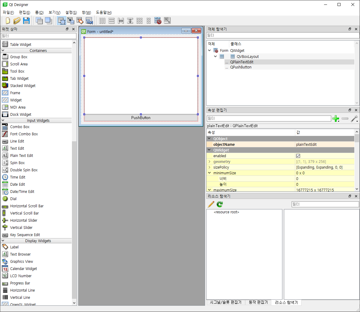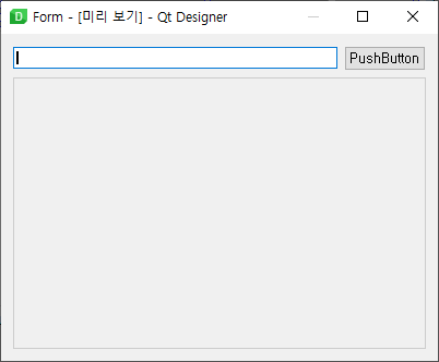 이 파일은 XML 형식의 텍스트 파일입니다.<?xml version="1.0" encoding="UTF-8"?> <ui version="4.0"> <class>Form</class> <widget class="QWidget" name="Form"> <property name="geometry"> <rect> <x>0</x> <y>0</y> <width>400</width> <height>300</height> </rect> </property> <property name="windowTitle"> <string>Form</string> </property> <layout class="QVBoxLayout" name="verticalLayout"> <item> <widget class="QWidget" name="widget" native="true"> <layout class="QHBoxLayout" name="horizontalLayout"> <property name="leftMargin"> <number>0</number> </property> <property name="topMargin"> <number>0</number> </property> <property name="rightMargin"> <number>0</number> </property> <property name="bottomMargin"> <number>0</number> </property> <item> <widget class="QLineEdit" name="lineEdit"/> </item> <item> <widget class="QPushButton" name="pushButton"> <property name="text"> <string>PushButton</string> </property> </widget> </item> </layout> </widget> </item> <item> <widget class="QPlainTextEdit" name="plainTextEdit"> <property name="enabled"> <bool>false</bool> </property> </widget> </item> </layout> </widget> <resources/> <connections/> </ui>