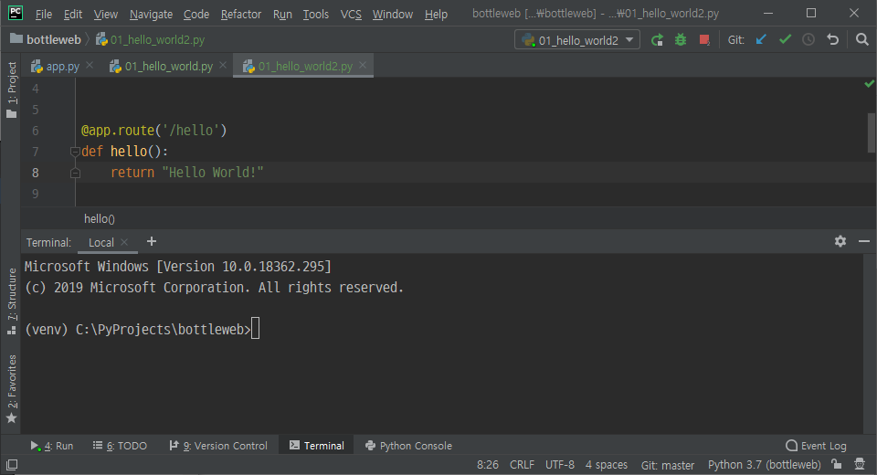 파이참 내부의 터미널 창. (venv) 확인~! Source code for bottle