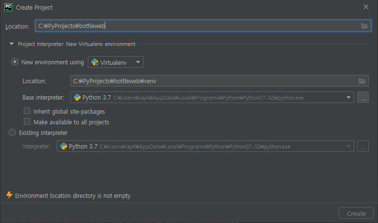 프로젝트를 만들 때 보이는 창. 가상환경에 대한 내용이 있습니다.