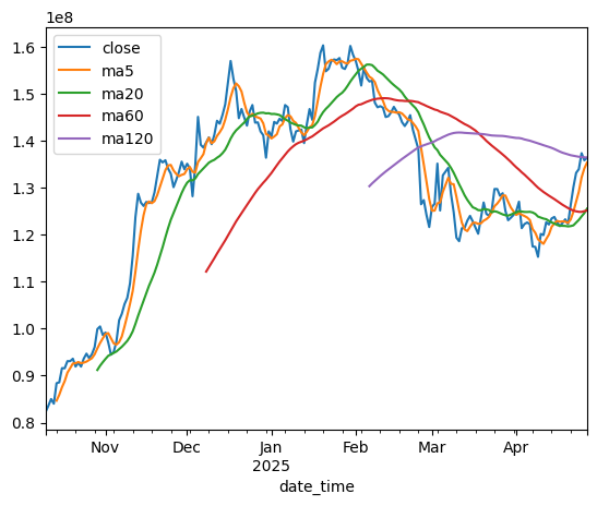 df_4_plot = pd.DataFrame() df_4_plot["close"] = df["trade_price"] df_4_plot["ma5"] = ma5 df_4_plot["ma20"] = df["trade_price"].rolling(20).mean() df_4_plot["ma60"] = df["trade_price"].rolling(60).mean() df_4_plot["ma120"] = df["trade_price"].rolling(120).mean() df_4_plot["date_time"] = df["candle_date_time_kst"] df_4_plot.set_index("date_time", inplace=True) df_4_plot.plot()