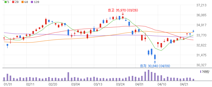 5, 20, 60, 120일 이동평균선이다.5일 이동평균선은