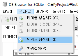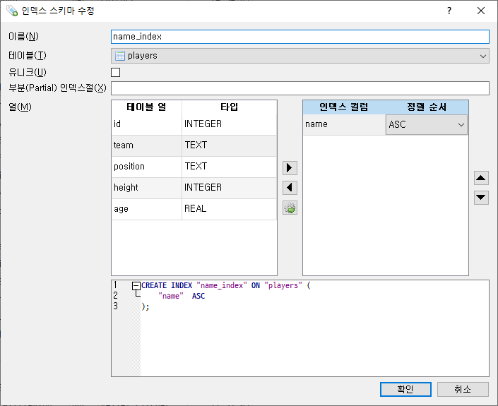 CREATE INDEX "name_index" ON "players" ( "name" ASC )데이터베이스 구조에서 확인.
