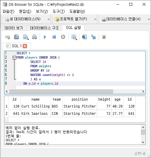 SELECT * FROM players INNER JOIN ( SELECT id FROM weights GROUP BY id HAVING count(weight) <> 1 ) AS w ON w.id = players.id서브쿼리와 조인