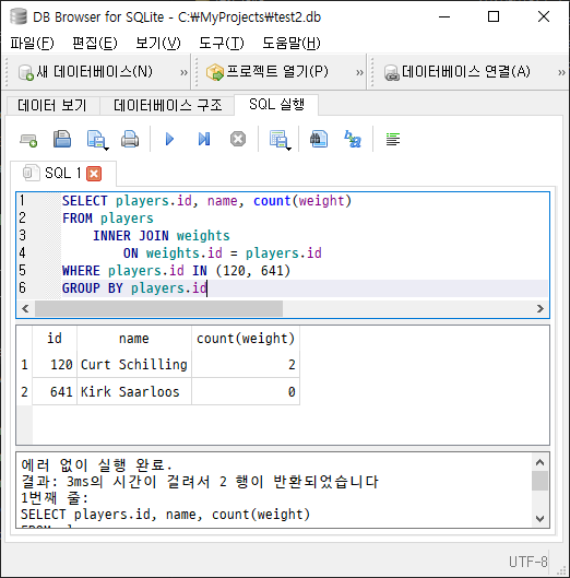 SELECT players.name, weights.weight FROM players INNER JOIN weights ON players.id=weights.id체중 측정횟수가 1이 아닌 선수들을 찾아보자.