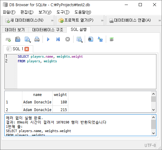 SELECT players.name, weights.weight FROM players, weights이렇게 조인을 하면 1,070,190 행이 출력되는데 --;