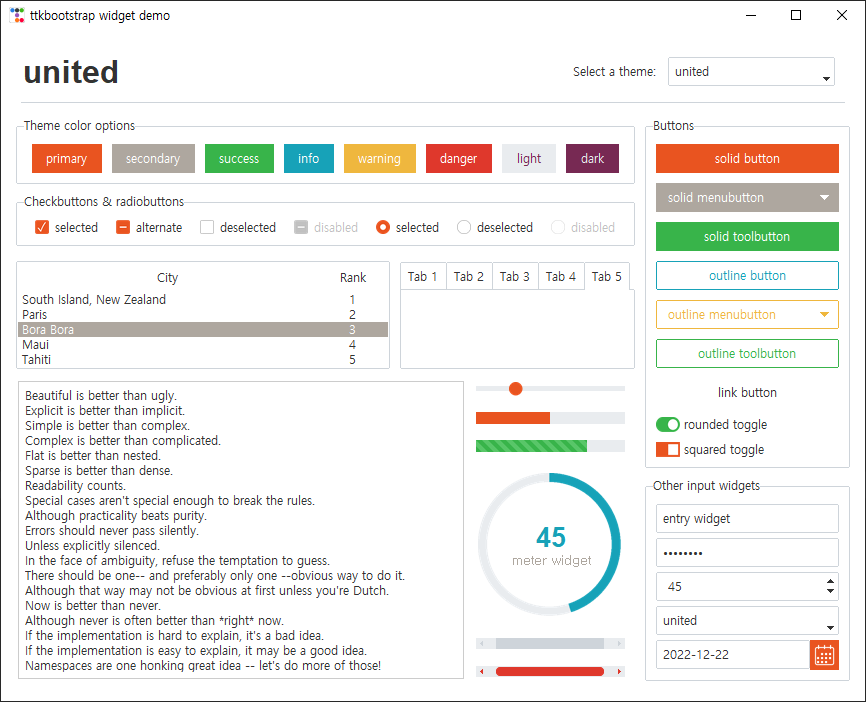 Themes ttkbootstrap comes packaged with a LOT of beautifully styled light and dark themes, which you can view in a demo by typing this command into your terminal after installing ttkbootstrap. >>> python -m ttkbootstrap You will see a demo screen that look